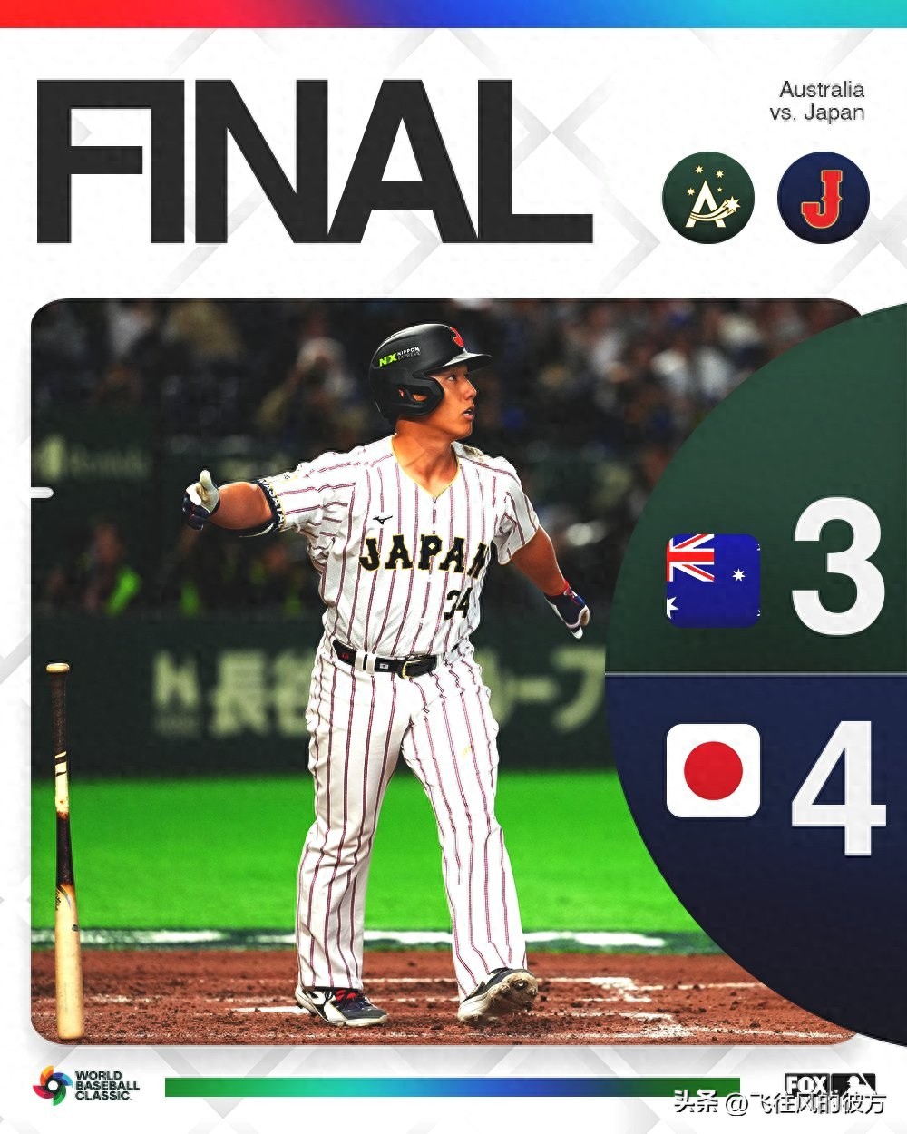 Before Yoshida stepped up to the plate, Australia's four pitchers combined with several sharp defensive plays to effectively stifle Japan's offense. Australia struck first in the sixth inning: after one out, outfielder Aaron Whitefield hit a double, then stole third base and scored on a throwing error by catcher Kenji Wakatsuki, giving Australia the lead.