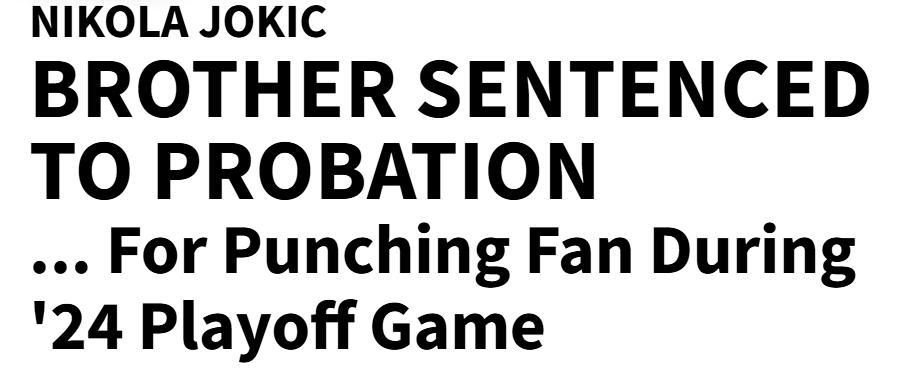 On October 11th Beijing time, Strahinja Jokic, brother of Denver Nuggets star Nikola Jokic, was given a 12-month probation sentence for punching a fan in the stands during the 2024 NBA playoffs.