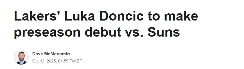 On October 14th Beijing time, Lakers head coach Reddick confirmed that Dončić will appear in the preseason matchup against the Phoenix Suns tomorrow (October 15th Beijing time).