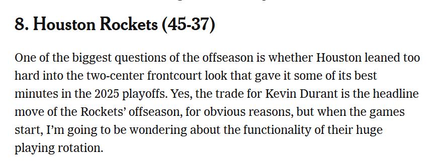 Even in the worst-case scenario, the Rockets’ strength won’t be weak. Although the team might stumble in solving lineup fit issues (especially early in the season and without VanVleet), with the combination of Thompson, Sengun, and Durant, the Rockets will still be a "must-watch team." Compared to some optimistic views, our expectations for this team are more cautious—They indeed "overcommitted" on frontcourt signings, resulting in a "guard shortage" after VanVleet’s injury.But it must be emphasized: if the Rockets can pull off another blockbuster trade, other teams will have to be very cautious.