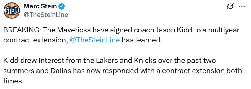On October 15th Beijing time, according to renowned reporter Stein, 52-year-old Kidd has signed a multi-year contract extension with the Dallas Mavericks. Over the past two offseasons, Kidd received offers from both the Los Angeles Lakers and the New York Knicks. The Knicks showed interest in Kidd while searching for a head coach, but the Mavericks refused to release him, leading many to expect Kidd would ultimately renew with Dallas.