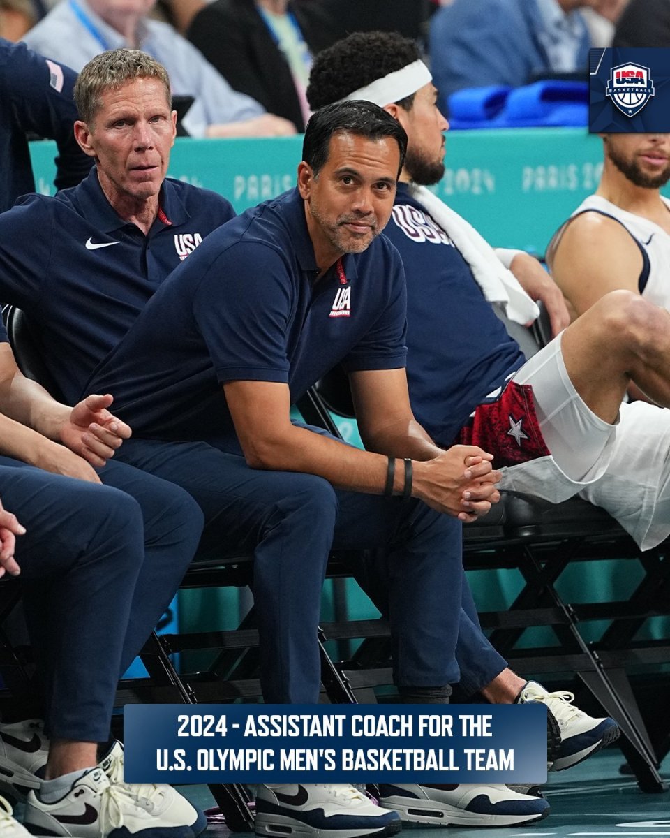 In addition to winning the 2024 Paris Olympic gold medal as an assistant coach, Spoelstra also served as assistant coach to Steve Kerr during the 2023 FIBA Men’s Basketball World Cup, where the USA team finished fourth; in 2021, he was head coach of the USA Men’s Select Team, which trained alongside the national team before the 2020 Tokyo Olympics.