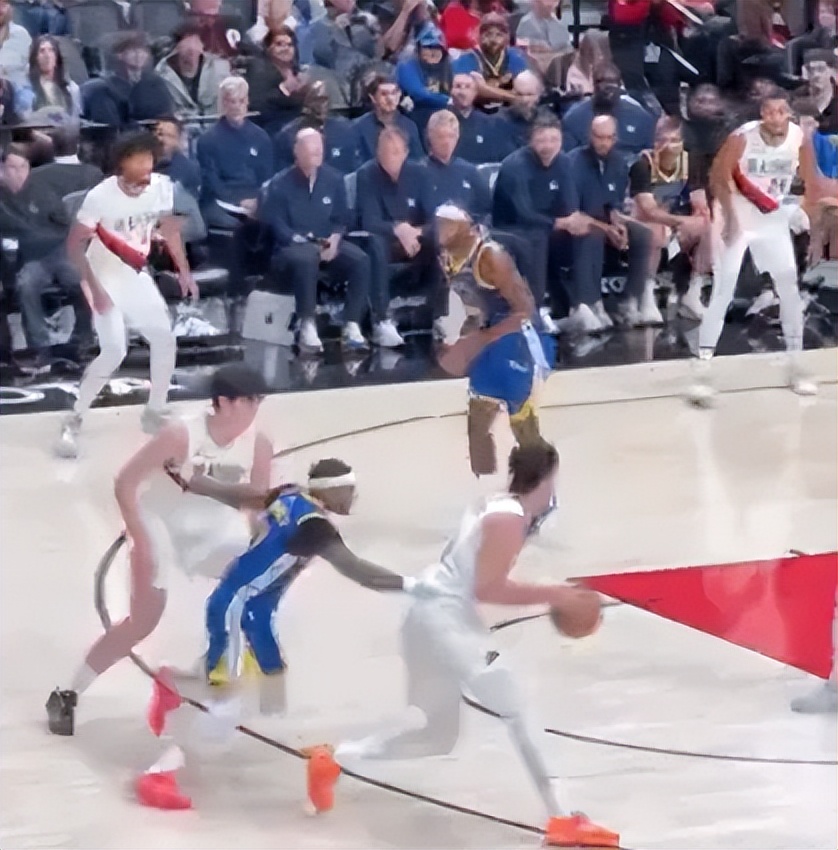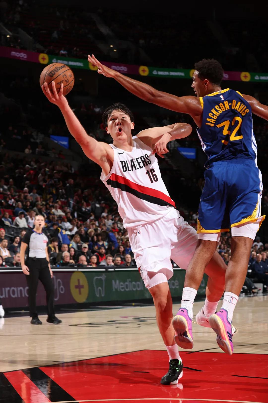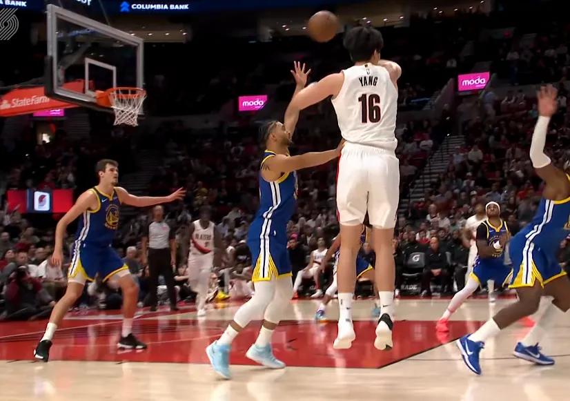 In the first half of the third quarter, the Warriors and Trail Blazers went back and forth in transition. Yang Hansen was constantly running back and forth in this fast pace but didn’t make much impact. It wasn’t until the Trail Blazers started feeding him the ball that he hit a three-pointer. Then Curry answered with a three of his own — it was surprising to see Yang Hansen and Curry trading threes in a preseason game.