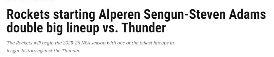 On October 21, Beijing time, Rockets sideline reporter Vanessa Richardson stated that for the 2025-26 NBA season opener versus the Thunder, the Rockets will deploy a starting lineup considered among the tallest and longest wingspan in NBA history.
