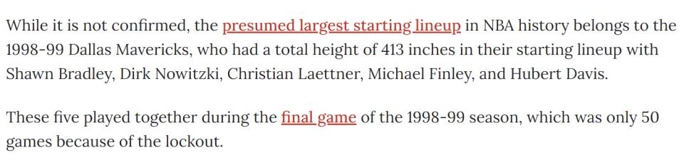 For reference, according to Basketball Network data, the tallest recorded starting lineup in NBA history was the 1999 Dallas Mavericks lineup—Hubert Davis, Michael Finley, Dirk Nowitzki, Chris Anstey, and Shawn Bradley—with a combined height of about 10.49 meters. These five only appeared together in the final game of the 1998-99 season, which was shortened to 50 games due to a lockout.