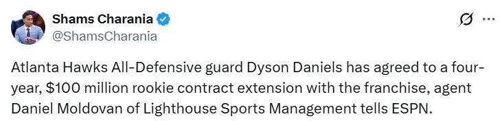 On October 21st Beijing time, reporter Shams reported that Dyson Daniels, the Atlanta Hawks’ top defensive guard, has agreed to a four-year, $100 million extension on his rookie contract with the team.