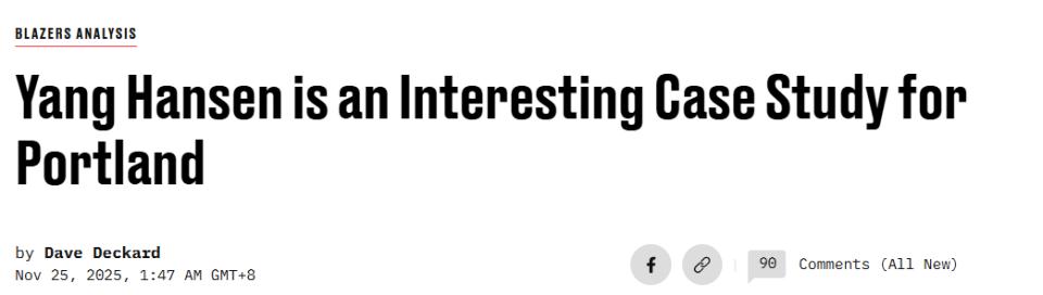 或許我們真正該擔心的,不是楊瀚森會怎樣、何時成長,而是為何他的成長承載了如此多期望。若開拓者正衝擊NBA總決賽,瀚森或許會被視為一場豪賭,他的進步會成為大家好奇與喜悅的焦點。但如今人們開始為他焦慮,正反映了開拓者當前的困境——或者更準確說,反映了他們距離目標還有多遠。
