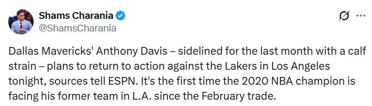 濃眉自10月30日起一直缺陣,最初預定在11月9日客場對陣華盛頓奇才時復出。然而,獨行俠老闆杜蒙特擱置了這一計畫——他聽從達拉斯健康與表現主管比爾茲伯勒的建議,堅持除非醫療數據證明濃眉無加重小腿傷勢風險,否則不會批准其出賽。周四訓練結束後,濃眉向媒體表示,他將在獨行俠週末背靠背對陣兩支洛杉磯球隊(湖人與快船)其中一場比賽中登場。