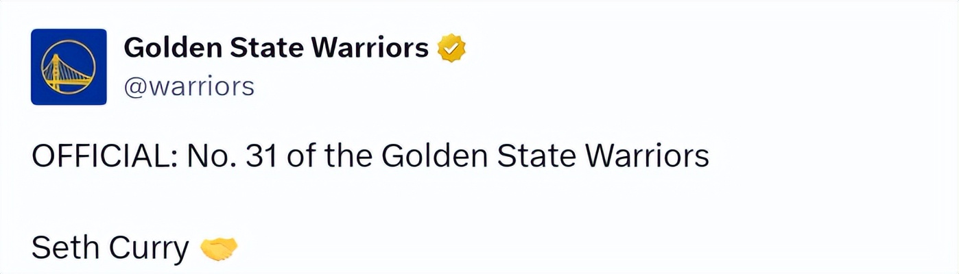 北京時間12月2日,金州勇士官方宣佈與自由球員後衛塞斯·庫里完成簽約。根據先前報導,勇士與他簽訂合約至本賽季結束。塞斯·庫里曾於10月2日首次與勇士簽約,參加訓練營後,於10月19日被裁掉。他在勇士隊將穿著31號球衣,而他的哥哥斯蒂芬·庫里則是30號。
