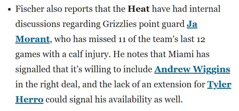 除了是字母哥的潛在新東家外,Fischer透露熱火內部已開始討論格林隊後衛莫蘭特,後者因小腿傷缺席球隊近12場比賽中的11場。Fischer指出,熱火已釋出信號,願意將維金斯納入合適的交易方案,而希羅至今尚未完成續約,這也可能意味著他已被列入球隊的可交易名單。