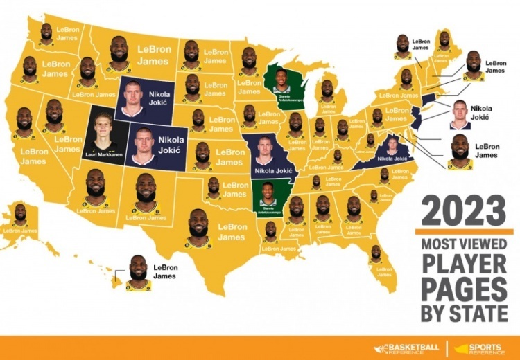回顧2023年,詹姆斯在41個州保持領先,其他上榜球員包括約基奇、字母哥與馬爾卡寧。