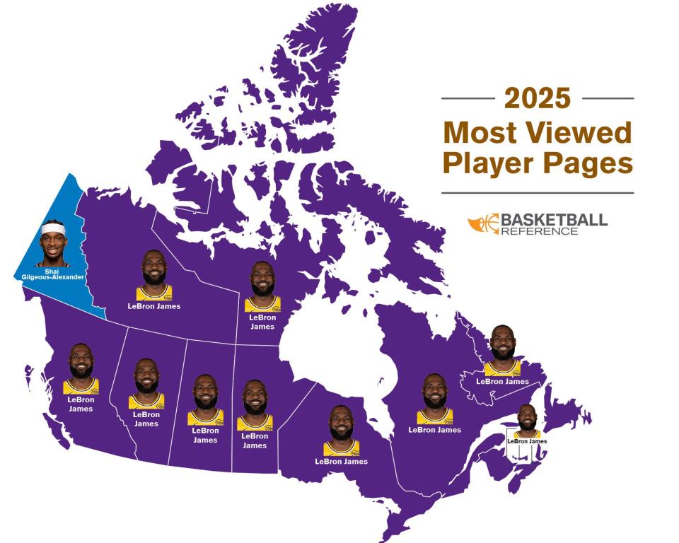 北京時間12月11日,根據數據網站BBR顯示,今年該網站在各州中被瀏覽次數最高的球員頁面分別為:詹姆斯(47州)、亞歷山大(俄克拉荷馬州)、約基奇(科羅拉多州)、字母哥(威斯康辛州)。加拿大幾乎也被詹姆斯全面佔據。