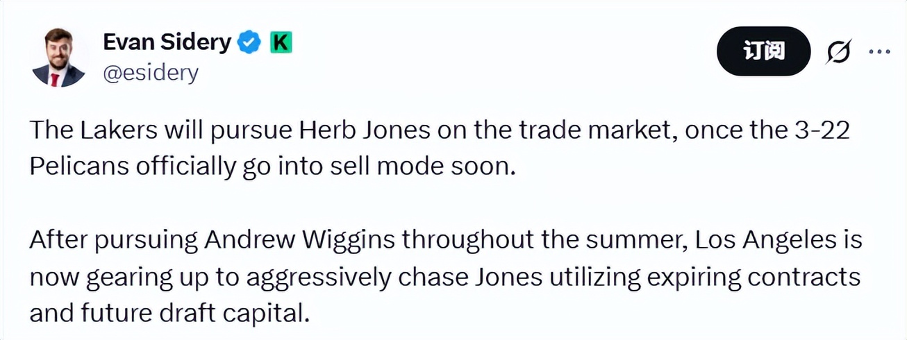 北京時間12月11日,據NBA記者Sidery透露,一旦目前戰績只有3勝22負的鵜鶘隊正式啟動甩賣,湖人將會在交易市場上追求赫伯特-琼斯。經過休賽期對維金斯的持續追蹤後,湖人現正計劃利用即將到期的合約和未來的選秀權,全力衝刺琼斯。