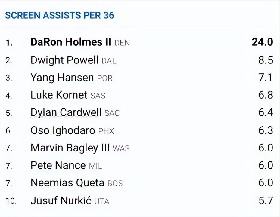 Lastly, it’s worth highlighting that according to NBA official statistics Yang Hansen currently averages 7.1 screen assists per 36 minutes this season, ranking third in the league. He trails only behind Daron Holmes and Dwight Powell.