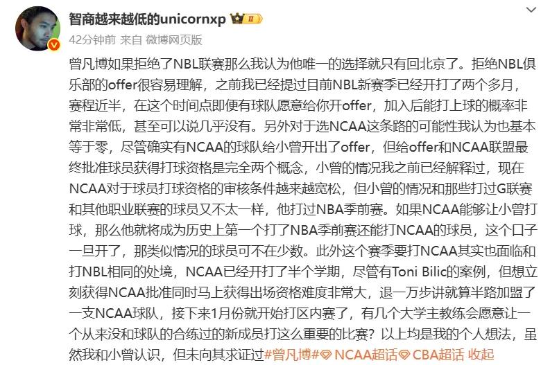 曾凡博正式放棄加盟澳洲NBL球隊的機會,眼下他唯一的去處只有回歸CBA,或者前往NCAA。