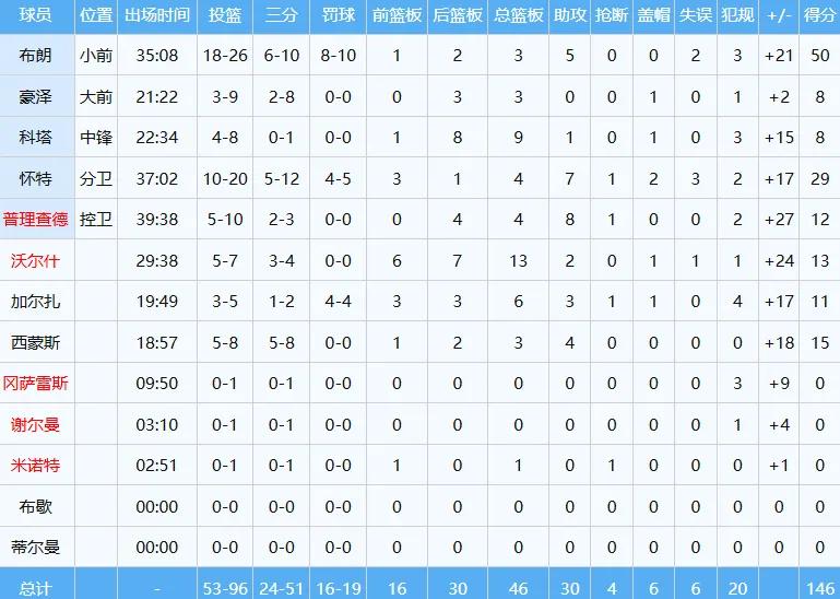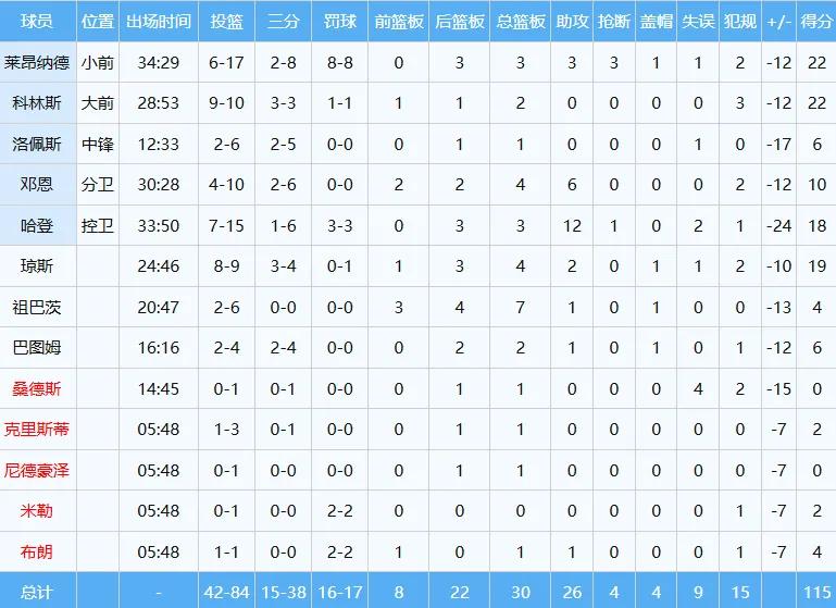 雖然情況尷尬,但不能把輸球的責任全推給祖巴茨,他本場是替補出場,快船全隊數據如下: