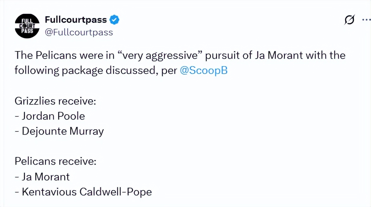 As of January 26th Beijing time, NBA reporter Brandon Robinson reported that the Pelicans are actively chasing Grizzlies star Morant and have engaged in talks involving multiple trade scenarios with Memphis.