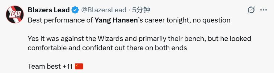 After the game, Yang Hansen’s performance drew widespread attention. The Blazers media outlet BlazersLead wrote: “Without a doubt, this was Yang Hansen’s best game in his career so far! Yes, the opponent was the Wizards, mostly their bench players, but he played confidently and composed on both ends of the floor. Plus-minus +11, the highest on the team.”