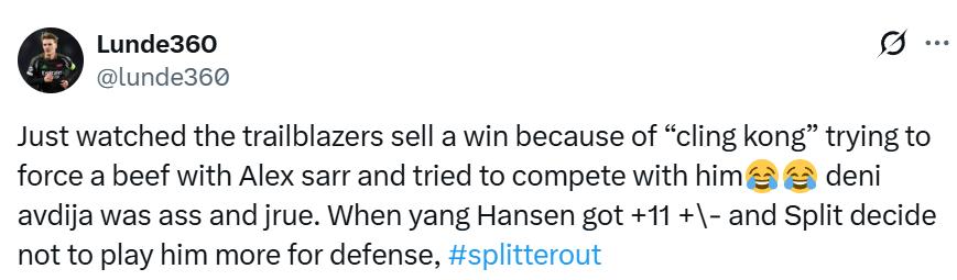 Fan lunde360 wrote: “Just finished watching the game, and the Blazers basically handed the win away! Klingen and Saar were competing hard, trying to force it. Avdija and Holiday played terribly. Yang Hansen’s plus-minus was +11, yet coach Splitter limited his minutes citing defense—#FireSplitter.”