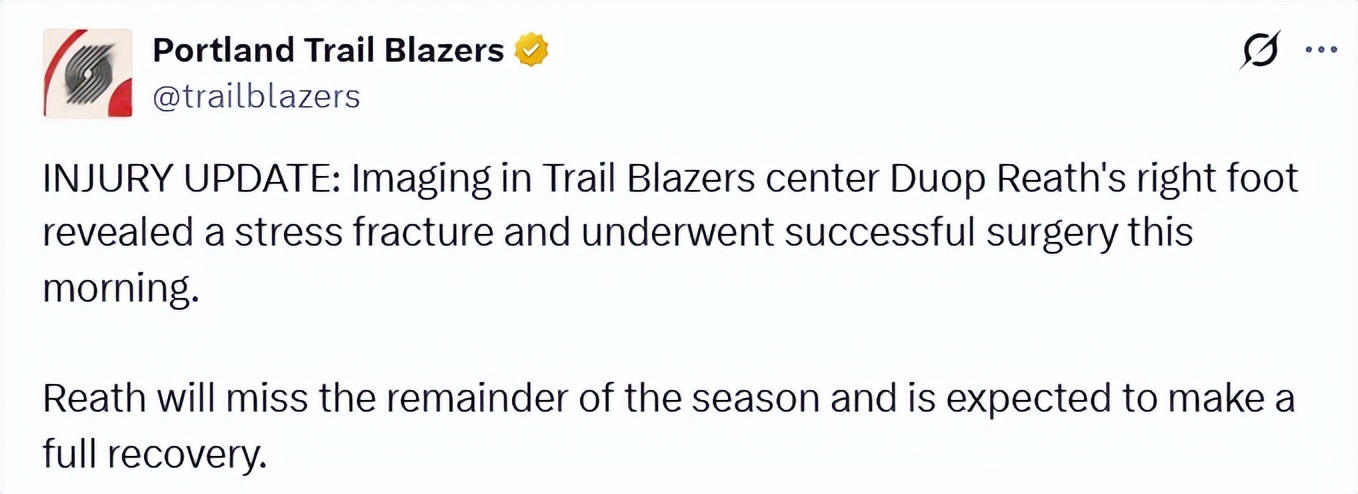On January 30th Beijing time, the Blazers released a new injury update stating that Duop Reece’s right foot scans showed a stress fracture, and he had successful surgery earlier today. Reece will be sidelined for the rest of the season but is anticipated to recover completely. Moreover, reports indicate that Henderson and Wesley are now in the last stage of their rehab and have begun engaging in full-team scrimmage sessions.