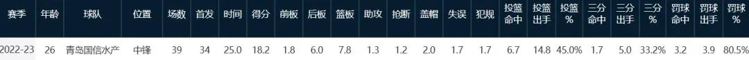 This player was with Qingdao team in the 22-23 season, playing 39 games, averaging 25 minutes, contributing 18.2 points, 7.8 rebounds, 1.3 assists, 1.2 steals, and 2 blocks per game. His shooting percentage was 45%, with an average of 1.7 three-pointers made at a 33.2% rate per game, while Yang Hansen officially started his CBA career in the 23-24 season.