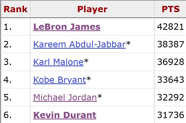 As a 15-time All-Star, 4-time scoring champion, 2-time NBA champion, 2-time Finals MVP, and 1-time regular season MVP, Durant currently ranks sixth on the all-time scoring list with 31,736 points, trailing only LeBron James, Kareem Abdul-Jabbar, Karl Malone, Kobe Bryant, and Michael Jordan.