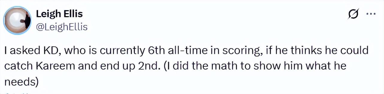 NBA reporter Ellis told Durant after doing the math: To overtake Kareem Abdul-Jabbar and claim the second spot on the all-time scoring list, Durant must average 25 points per game across the next 268 contests he participates in.