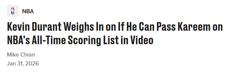 “I never want to put limits on myself, but those who came before set the bar way too high,” Durant said. “Just look at the top three or four scorers in history — you have to compete in the league for at least 20 seasons to even approach that mark, and maintain elite performance throughout those 15 to 20 years. So I prefer to take it naturally — play in the league a bit longer, maybe over 20 years, and then see where I end up. If I do make it into that group, great; if not, I just want to keep playing basketball in the league.”