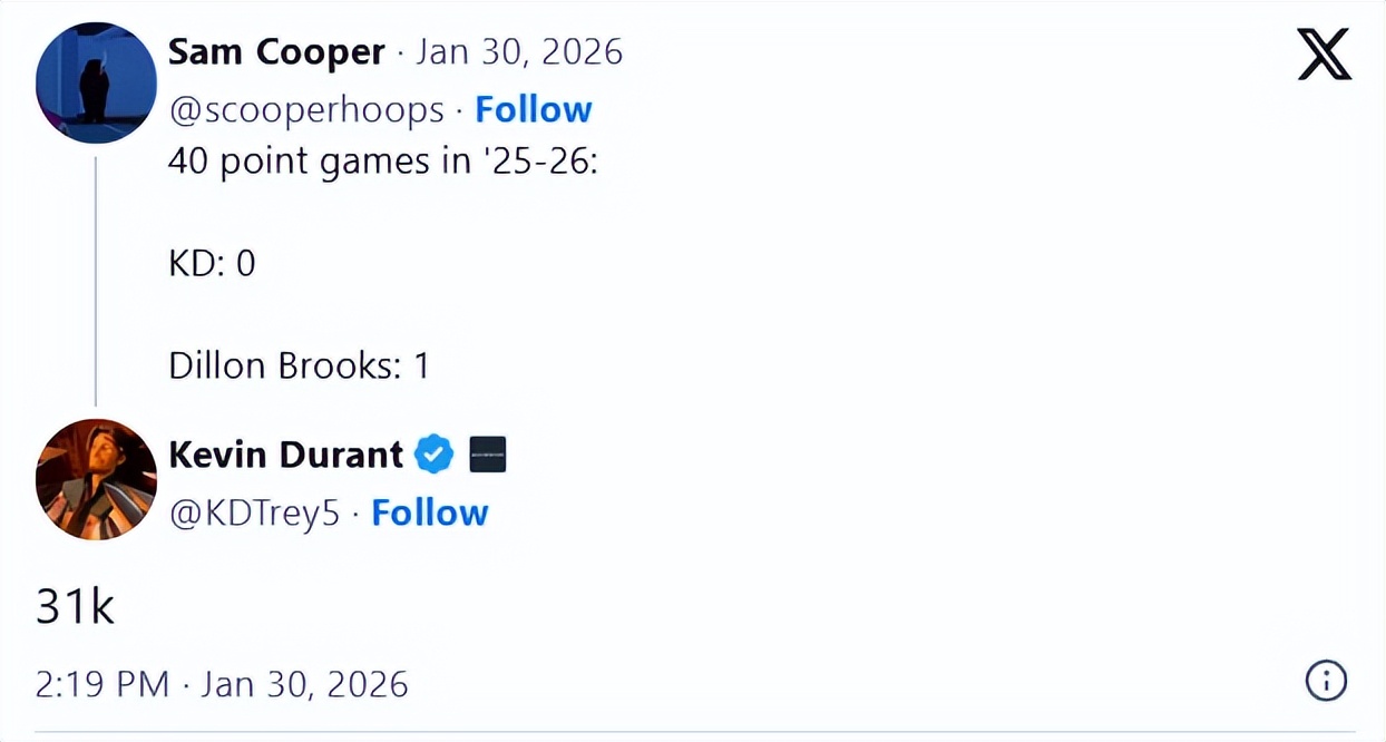 As one of the trade assets for Durant, Dillon has been performing exceptionally this season, recently scoring a career-high 40 points in a single game. Some fans pointed out that during his time with the Suns, Dillon had one 40+ point game, more than Durant’s zero, to which Durant replied: “31K,” clearly referencing his career total of 31,736 points.