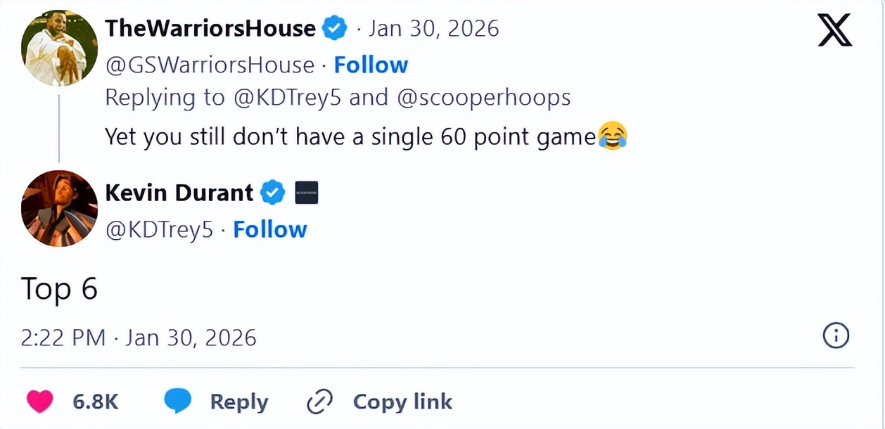 Other fans reminded him that he has never scored 60 points in a single game, and Durant responded: “Top 6.” This was clearly to inform fans that he recently entered sixth place on the NBA all-time scoring list.