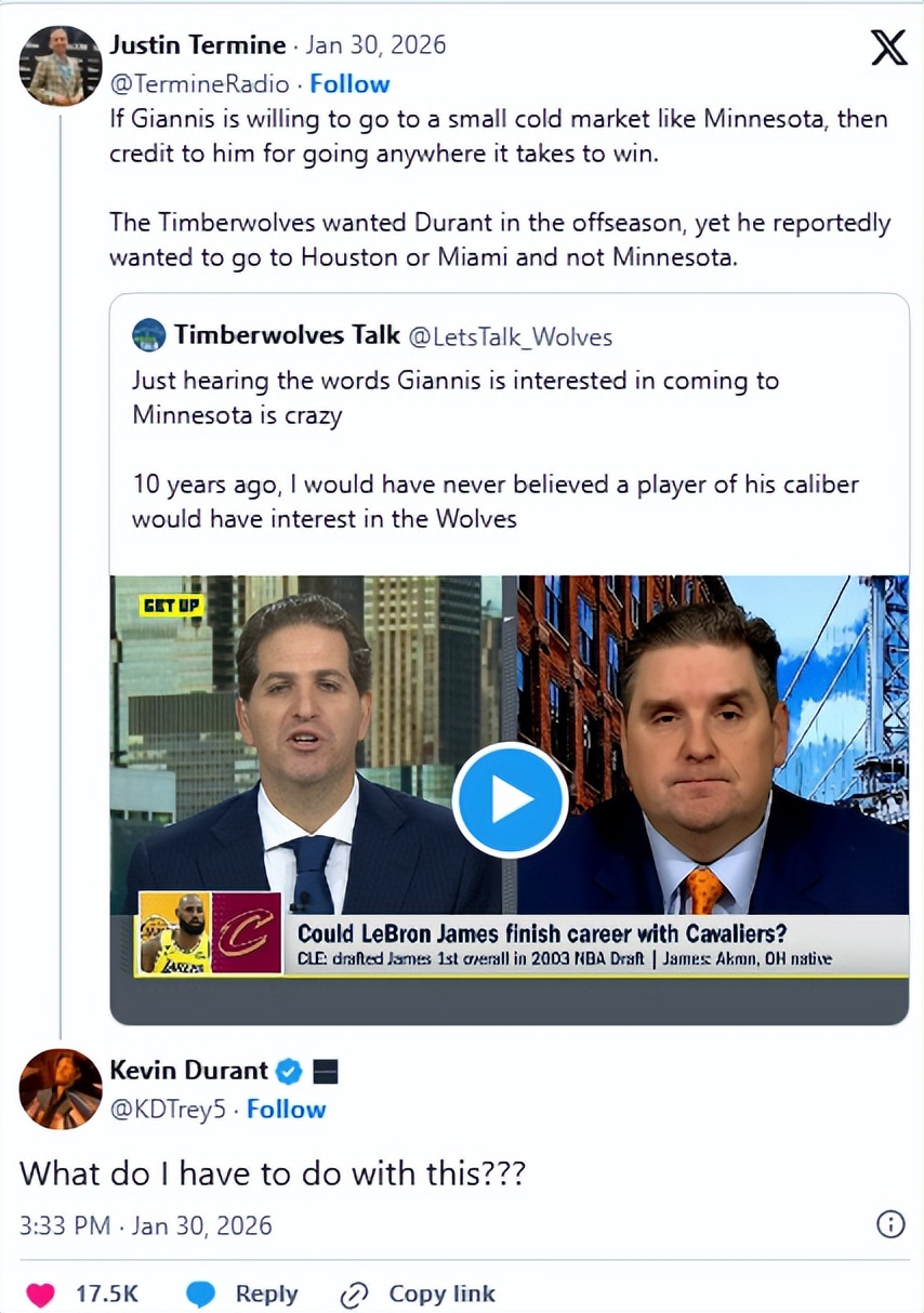 Then NBA reporter Termine shared the post, commenting: “If Giannis is willing to go to a small market like Minnesota, his determination to win a championship no matter where is truly admirable. The Timberwolves tried to get Durant during the offseason, but reportedly he only wanted to go to Houston or Miami, not Minnesota.”