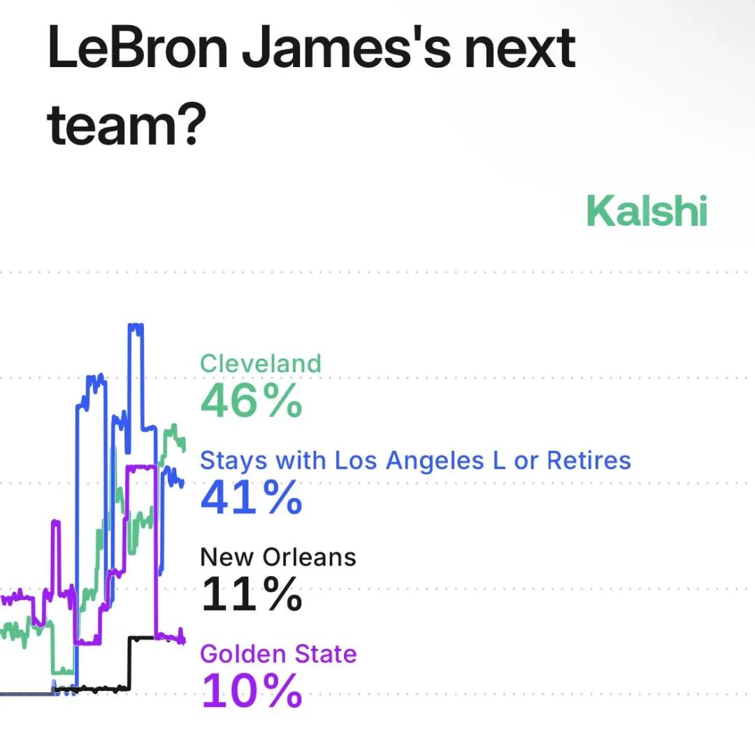 Today, the market prediction platform Kalshi updated the probabilities for LeBron’s next team, with the chance of him returning to the Cavaliers soaring to first place at 46%, followed by staying with the Lakers or retiring. Details are as follows: