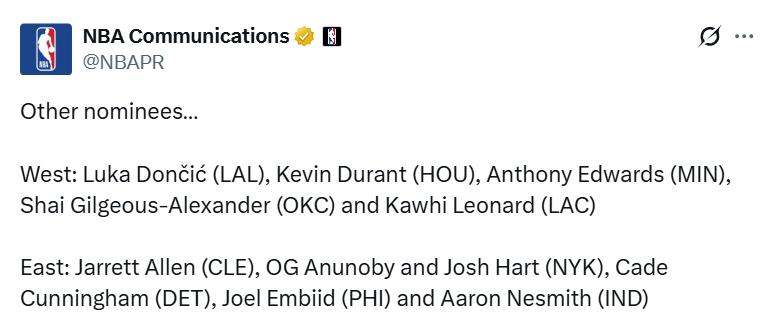 West: Doncic (Lakers), Durant (Rockets), Edwards (Timberwolves), Alexander (Thunder), Leonard (Clippers)
