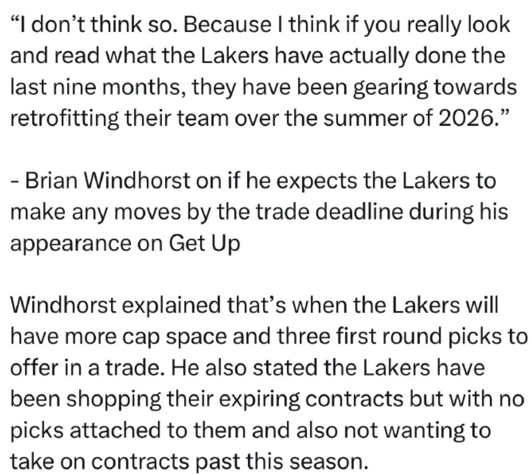Another NBA reporter, Windhorst, also commented: “I don’t expect the Lakers to make any moves before the trade deadline. If you carefully review the Lakers’ actions over the past nine months, it’s clear they’ve been preparing for a roster rebuild in the summer of 2026. By then, the Lakers will have more cap space and three first-round picks for trades. Currently, they are shopping expiring contracts without including draft picks and are reluctant to take on contracts beyond this season.”