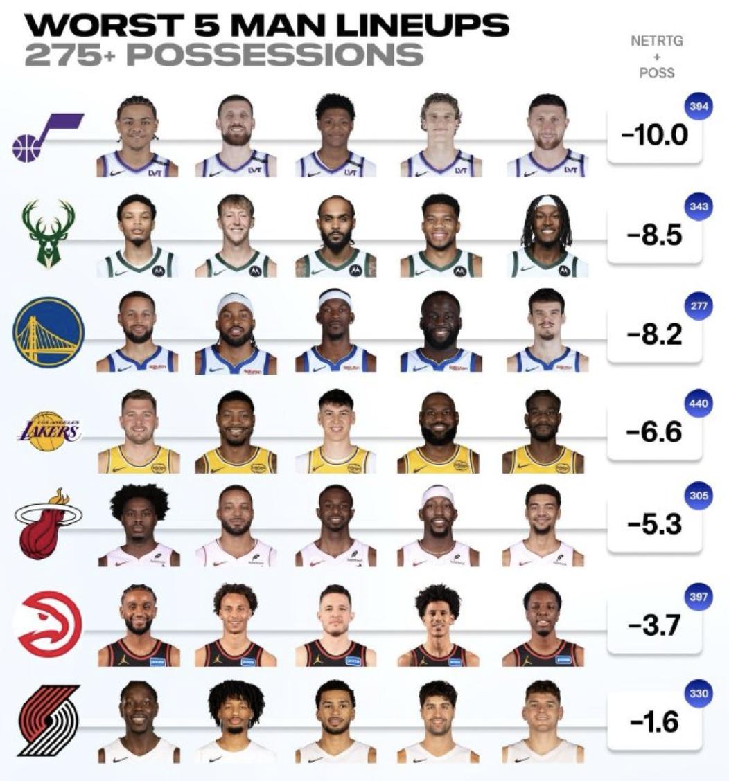Since Reaves’ injury, the Lakers have mostly relied on a starting lineup of Doncic, Smart, LaRavia, LeBron, and Ayton. Their record with this lineup is 9 wins and 7 losses, ranking fourth from the bottom in net offensive and defensive efficiency, playing a total of 440 possessions with a plus-minus of -6.6.