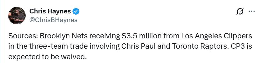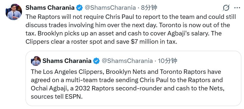 On February 5th Beijing time, insider Shams reported that the Clippers, Nets, and Raptors finalized a three-team trade concerning Paul. The details are as follows —