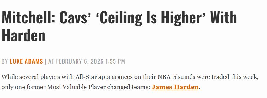 On February 7th Beijing time, according to The Athletic reporter Tony Jones and Cleveland.com reporter Chris Fedor, the night before the Clippers and Cavaliers finalized their trade, Harden and Mitchell had a lengthy conversation. This talk convinced both star guards that they wanted to be teammates and shared optimism about the Cavaliers' championship potential.