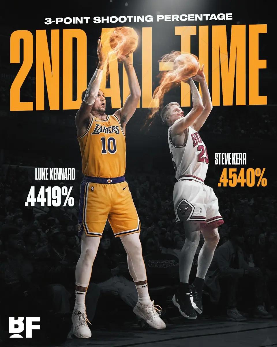 Kennard’s addition provides the Lakers with much-needed perimeter scoring. Over his career, he has maintained a three-point shooting accuracy of 44.2% (ranking second all-time in the league, just behind Korver’s 45.4%), and this season he tops the league with a 49.7% three-point shooting rate.