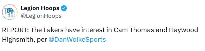 On February 7th Beijing time, as reported by Lakers' Woike, the team is eyeing potential buyout market targets. League insiders reveal that wing player Haywood-Hay Smith is among their favored picks, contingent on his knee recovery. Another candidate is his ex-Nets teammate Cameron Thomas, who is a more debated choice.