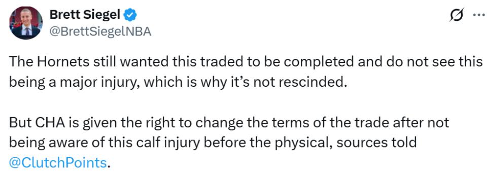 Insider Siegel reported that the Hornets still intend to complete the trade and believe the injury is not severe enough to cancel the deal.