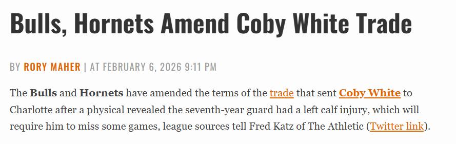 On February 7th Beijing time, The Athletic reported that the Bulls and Hornets have agreed to modify the trade terms for Cody White. The earlier medical exam showed that the guard, who has played in the league for seven years, suffered a left calf injury and will be sidelined for multiple games.