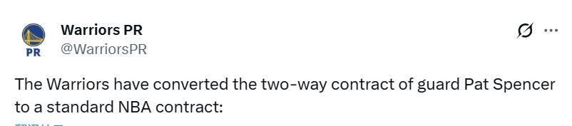 On February 8th Beijing time, the Warriors officially announced that Pat Spencer's two-way contract has been upgraded to a full NBA contract, with the term lasting through this season as reported by Shams. This 1.88-meter point guard is now eligible to participate in the remaining regular-season games and also the playoffs, which was not possible under his prior two-way deal. Additionally, the Warriors are interested in signing Lonzo Ball, who was recently waived by the Jazz.