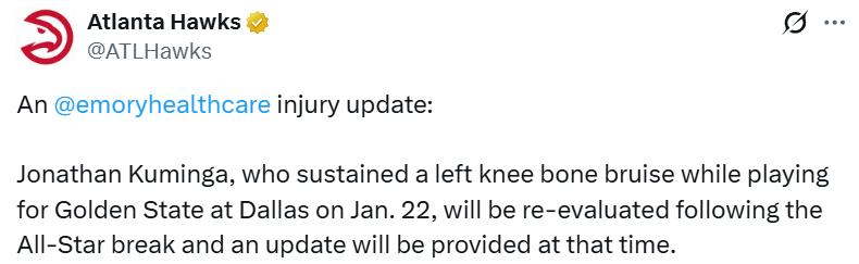On February 8 Beijing time, the Atlanta Hawks officially declared that their newly acquired forward Jonathan Kuminga has a left knee bone bruise and will have his injury reassessed following the All-Star weekend.