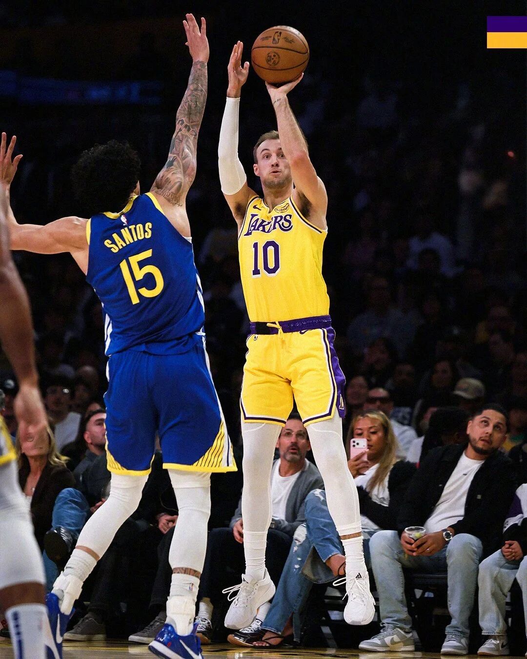 Today, the Lakers hosted the Warriors. Doncic was out with a slight hamstring pull, and Ayton was sidelined due to knee discomfort. The Warriors started Spencer, Melton, Moody, Santos, and Draymond Green. The Lakers' starters were Smart, LaRavia, Hachimura, LeBron James, and Hayes.