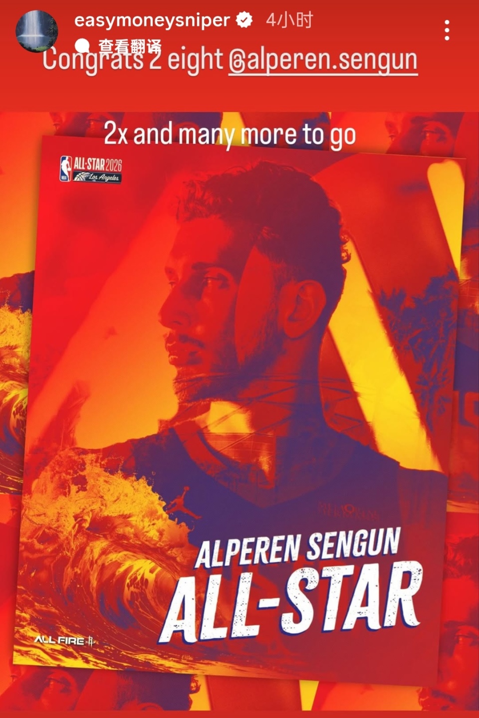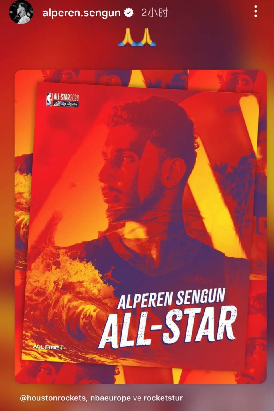 Shen Jing himself shared the All-Star poster on his Instagram, accompanied by two folded hands emojis, expressing his sincere thanks for this selection. Rockets teammate Durant also posted the same image, writing: "Congrats to number 28 Shen Jing, twice now, and many more to come!"