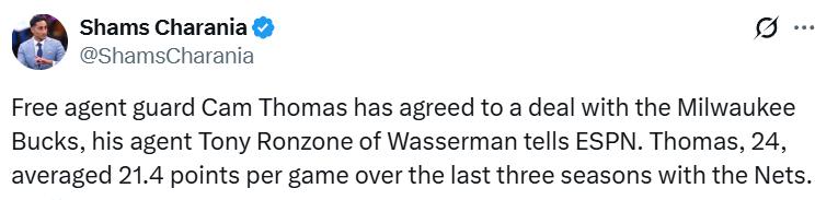 Previously, reporter Fischer mentioned that despite the Nets receiving trade proposals for Thomas, the Bucks were the sole team with real interest. Now that Thomas is a free agent, signing with Milwaukee is a natural outcome.
