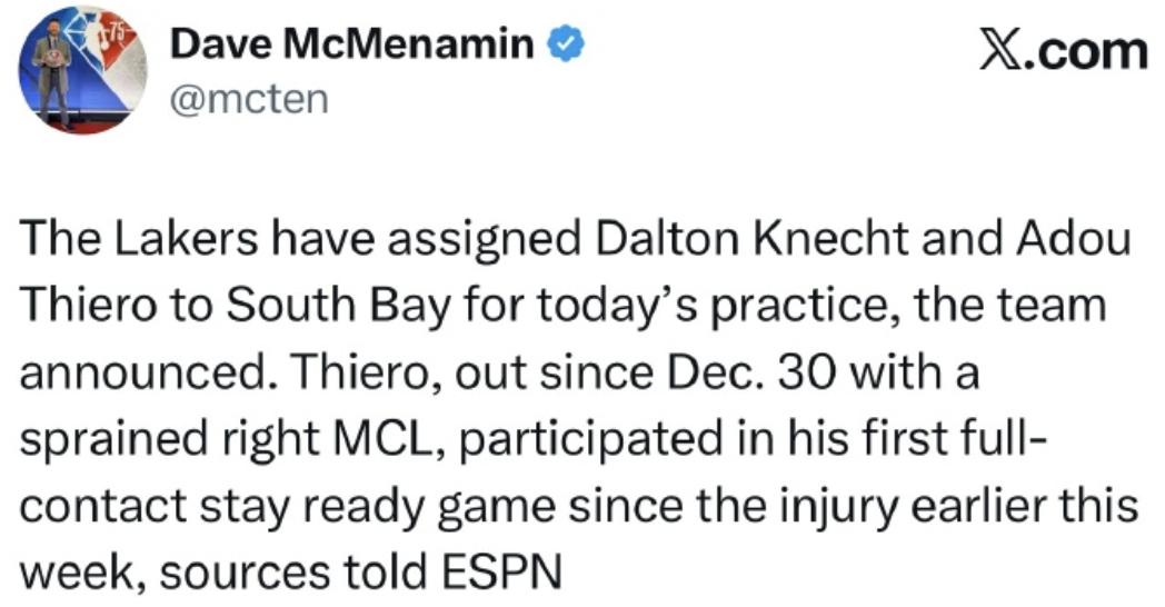Today, the Lakers also officially announced that guards Knecht and forward Adu Thiero have been assigned to the South Bay Lakers in the development league. According to ESPN sources, Adu Thiero has been out since December 30th due to a right medial collateral ligament sprain, and he participated in his first scrimmage since the injury earlier this week.