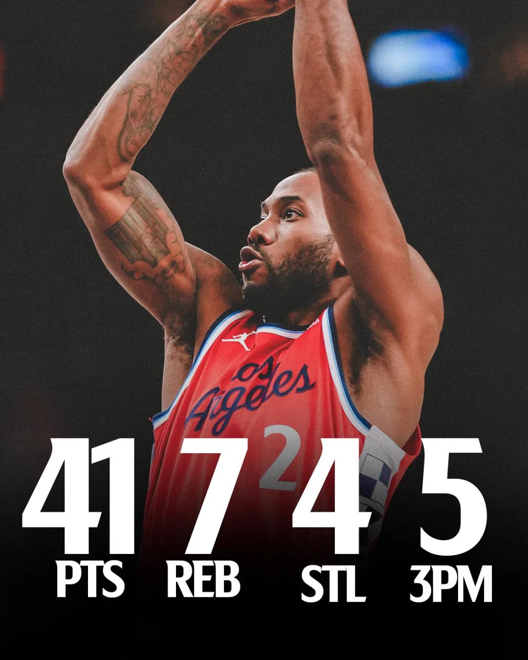 Throughout the entire game, Leonard played 33 minutes, shooting 14 of 30, including 5 of 11 from three-point range and 8 of 10 from the free-throw line, finishing with a team-high 41 points, along with 8 rebounds, 2 assists, and 4 steals.