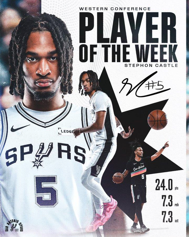 In the past week, Castle averaged 24 points, 7.3 rebounds, 7.3 assists, and 3.0 steals per game, shooting 63% from the field, helping the Spurs achieve a 3-0 record.