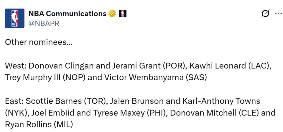 West: Klingenberg and Grant (Trail Blazers), Leonard (Clippers), Murphy (Pelicans), Wembanyama (Spurs)